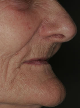Abb. 1.1: Eingefallenes Gesicht nach Verlust aller Zähne und greisenhaftes Aussehen.Abb. 1.2: Verjüngung nach Eingliederung eines Zahnersatzes im Ober- und Unterkiefer.