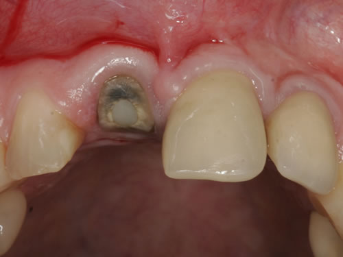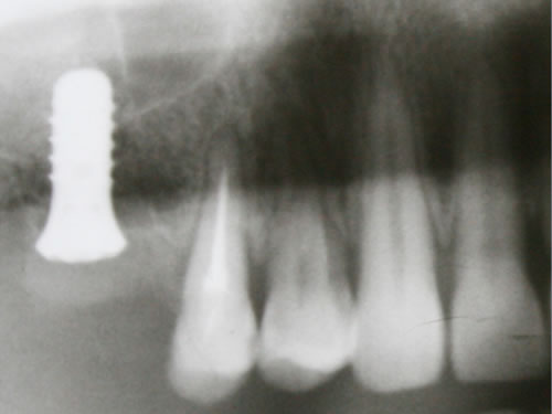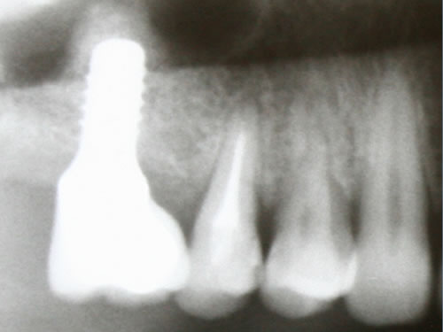 Abb. 2.3: Wurzelrest im Kiefer.Abb. 2.4: Sofortimplantation nach Entfernung des reizlosen Wurzelrestes mit Abdeckschraube verschlossen.