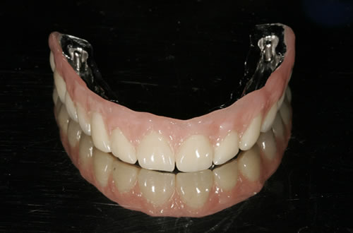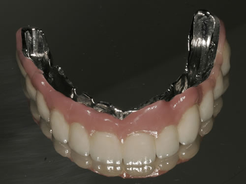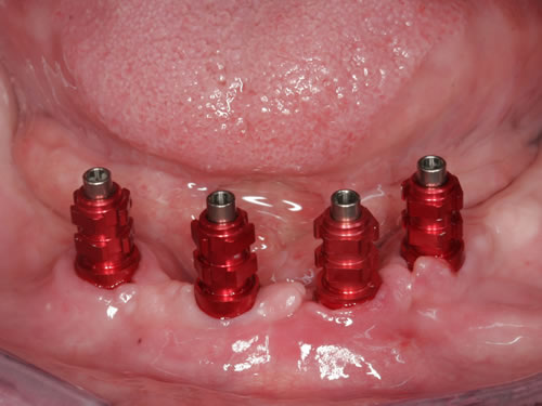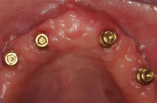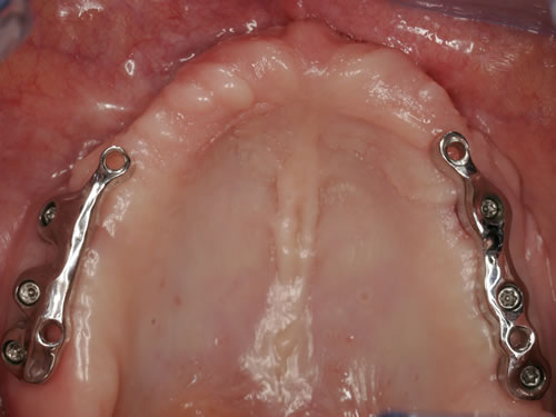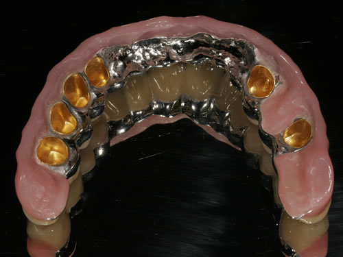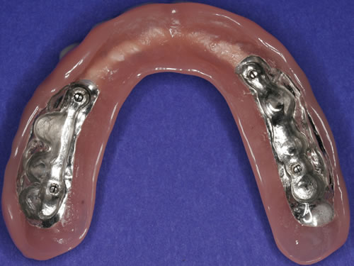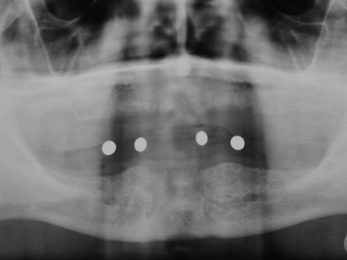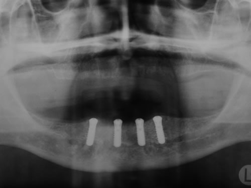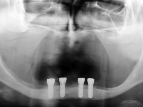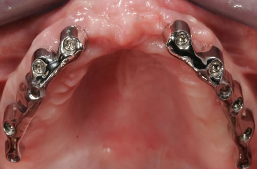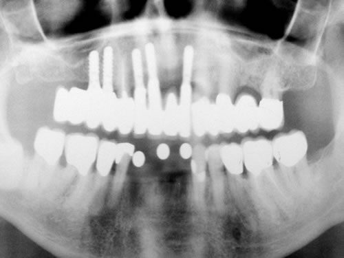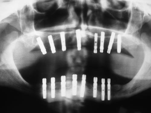 Die dankbarste Einsatzmöglichkeit für Implantate ist der zahnlose Kiefer. Prothesen können auf vier oder mehreren Pfeilern so befestigt werden, dass das Kauen und Sprechen wieder ohne Schwierigkeiten möglich ist.