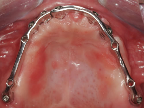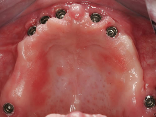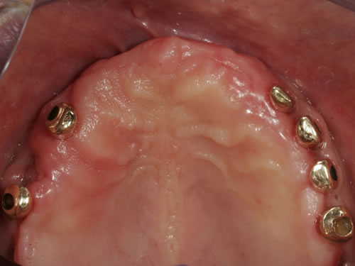 Abb. 3.15: Zahnloser Oberkiefer mit sieben Implantaten versorgt.Abb. 3.16: Eingeschraubte Unterkonstruktion zur Befestigung des zahntragenden Anteils.Abb. 3.17: Eingesetzte herausnehmbare, gaumenfreie Brücke.Abb. 3.18: Eine zufriedene Patientin.