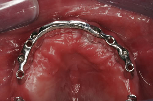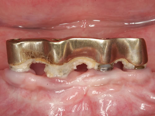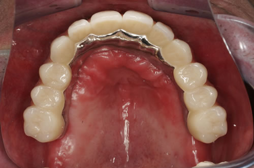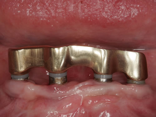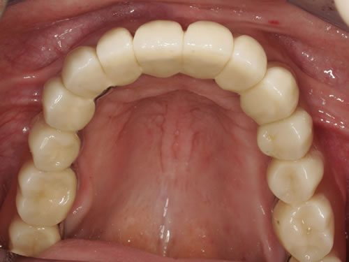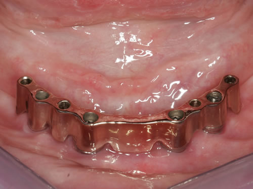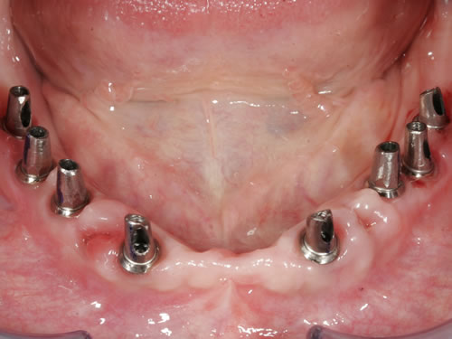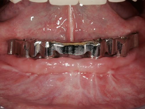 Abb. 3.13: Zahnloser Unterkiefer mit 8 Implantaten festsitzend versorgt.Abb. 3.14: Ansicht der einzementierten Brücke.