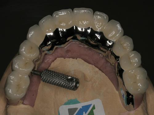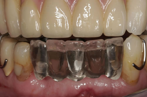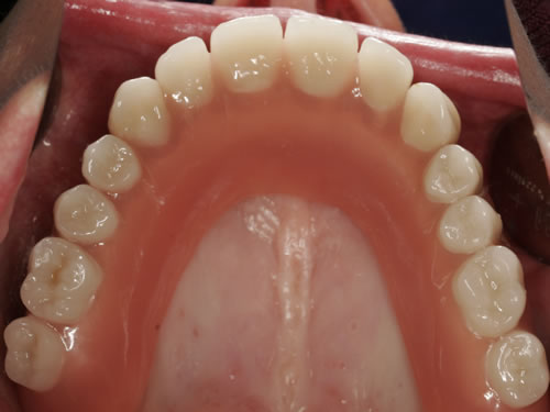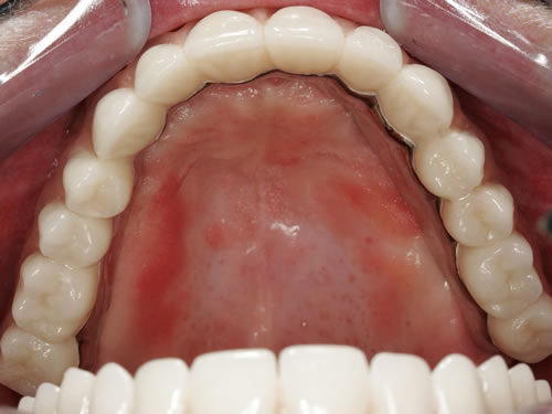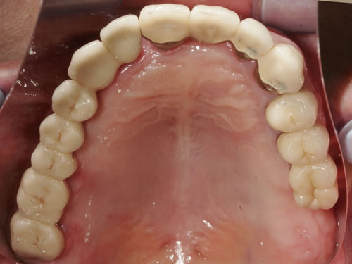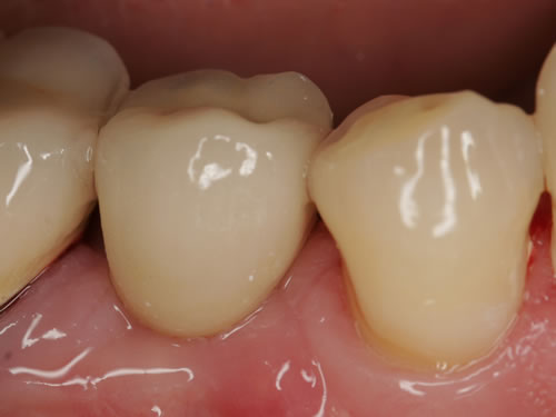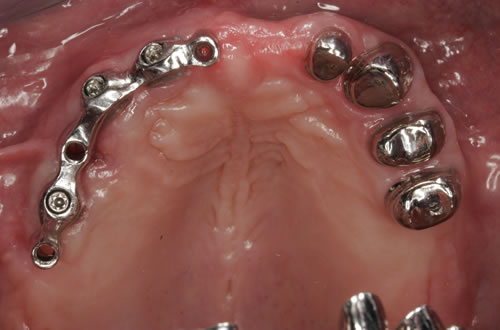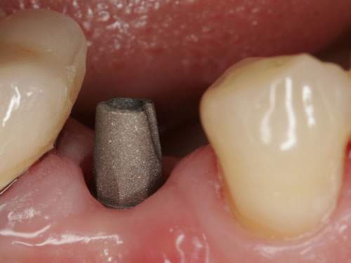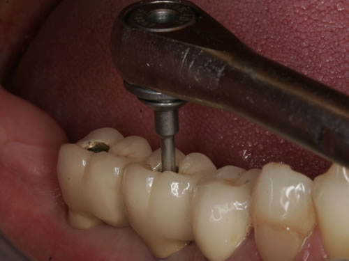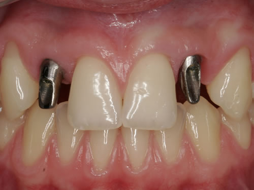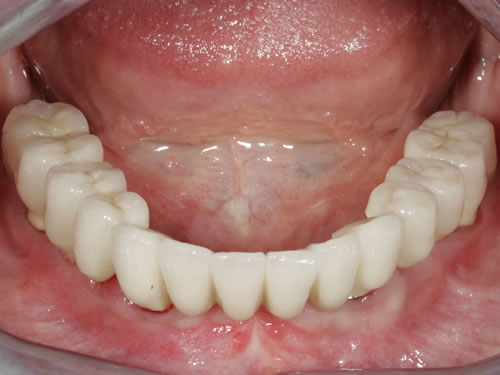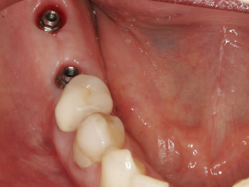 Mit Hilfe künstlicher Zahnwurzeln kann bei derartig verkürzten Zahnreihen im Unterkiefer eine Brücke angefertigt werden. Damit lassen sich das "Herunterwachsen" oder "Heraufwachsen" (Elongation) der Gegenzähne so wie das Kippen verhindern und die Kaufunktion mit einem festsitzenden Zahnersatz wiederherstellen.
