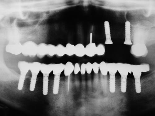 Auch bei sehr großen Zahnlücken kann nach der Einpflanzung künstlicher Wurzeln ein festsitzender Zahnersatz ermöglicht werden, wo sonst nur eine Prothese angefertigt werden könnte.