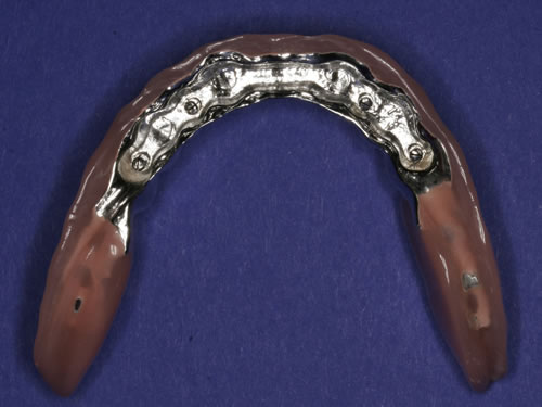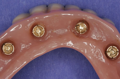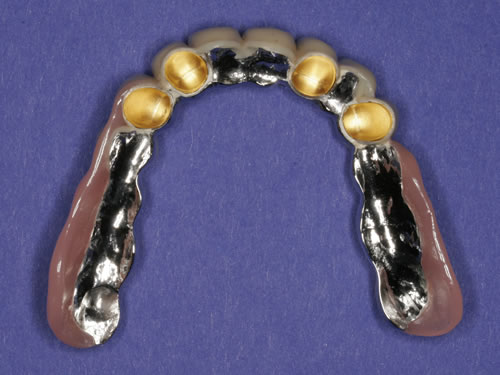 Diese Beispiele ließen sich endlos fortführen. Sie zeigen die Probleme bei der Versorgung zahnloser Kiefer, wie sie immer wieder geschildert werden. Mit Hilfe sehr einfacher Maßnahmen kann durch die Einpflanzung künstlicher Zahnwurzeln eine instabile Prothese soweit befestigt werden, dass die Kau- und Sprechfunktion wieder hergestellt ist. Manchmal kann die alte Prothese weiterverwendet werden, in dem man in die Prothesenbasis Sekundärteile einarbeitet, die für Halt sorgen (Abb. 3.5, 3.6). Bei aufwendigeren Steg- oder Teleskoparbeiten muss auch der Zahnersatz der auf den Implantaten fixiert wird neu angefertigt werden. Diese Arbeiten werden dann brückenartig und sehr grazil gestaltet. (Abb. 3.7 bis 3.12).