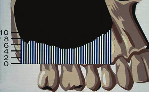 Innerhalb von knapp zwei Jahren war der letzte obere Backenzahn heruntergewachsen, sodass er beim Zusammenbeißen im hinteren Abschnitt fast die Schleimhaut des Unterkiefers berührte.