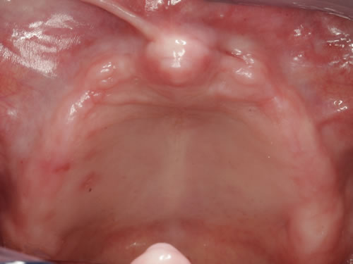 Eine 50-jährige Patientin hat alle Zähne im Oberkiefer verloren, da Zahnbehandlungen nach ihren Angaben immer ausgesprochen schwierig waren. Jede Berührung ihres Kiefers führte zu einem Würgereiz, der zur Unterbrechung der Behandlung zwang. Zuletzt ist sie nur noch bei Zahnschmerzen und zum Zähneziehen in die Praxis gegangen. Das Anfertigen der Prothesen war nur nach der Einnahme von Beruhigungstabletten möglich. Sie berichtet, dass sie bei jedem Kieferabdruck habe erbrechen müssen.
