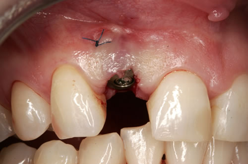 Mit einem Schnitt in der Schleimhaut wird der Kieferknochen freigelegt, mit dem Bohrer wird ein Implantatfach angelegt, welches der Implantatform entspricht. Danach wird das Implantat eingesetzt und die Schleimhaut wieder vernäht. Die Nähte werden nach etwa einer Woche entfernt.