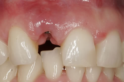 Im Alter von 12 Jahren hatte ein jetzt 20-jähriges Mädchen durch einen Skateboardunfall zwei Schneidezähne im Oberkiefer verloren (Abb. 3.33). Zunächst wurden die Zähne wieder eingesetzt, doch nach 2 Jahren lösten sich die Wurzeln auf und mussten entfernt werden (Abb. 3.34). Damit das Mädchen nicht ohne Zähne herumlaufen musste, wurden beide Frontzähne durch eine kleine Prothese ersetzt (Abb. 3.35). Das Mädchen hat die Prothese ohne zu klagen regelmäßig getragen. Inzwischen sträubt sie sich allerdings gegen diesen herausnehmbaren Zahnersatz, da sie einen Freund gefunden hat und ihr das Tragen der Prothese jetzt unangenehm ist. Die Lücke wurde durch 2 Implantate und Einzelkronen geschlossen (Abb. 3.36).