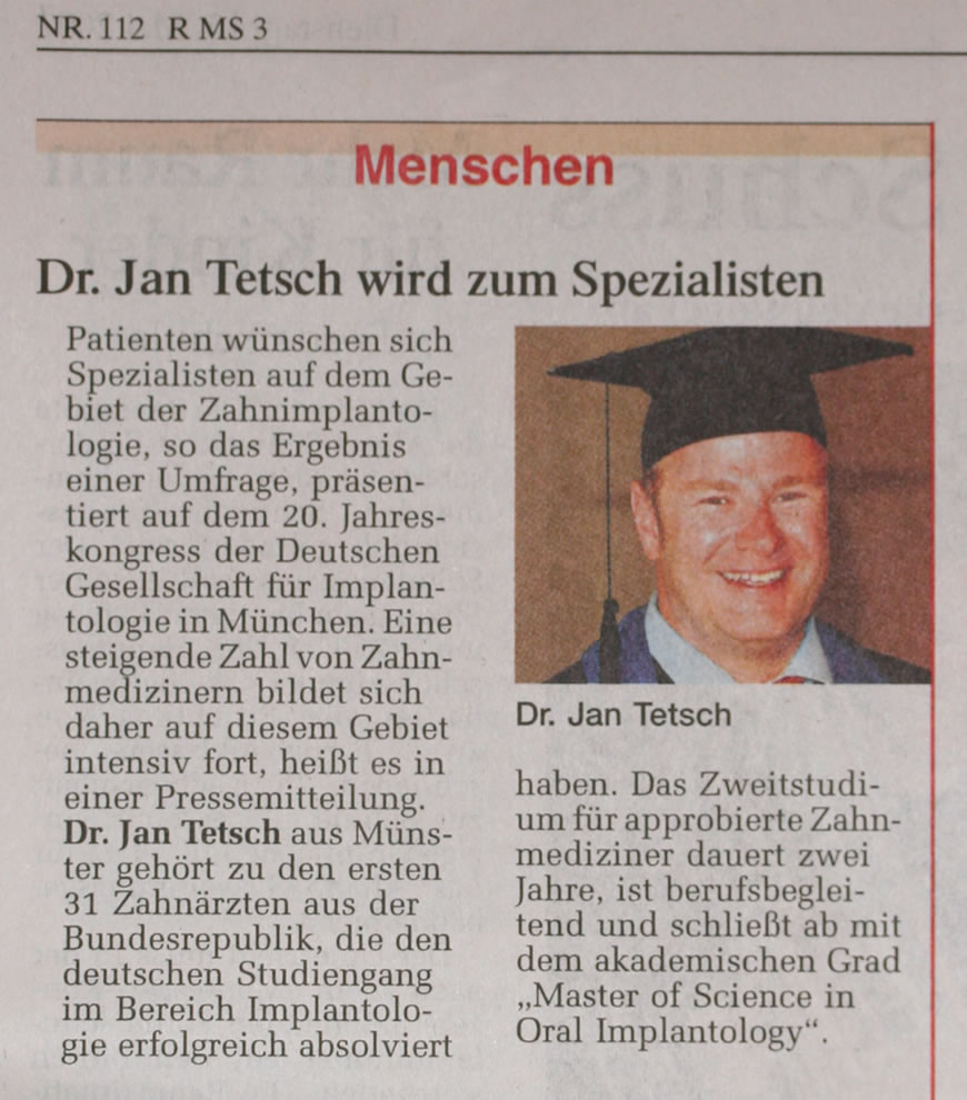 | J. Tetsch, P. Tetsch | Der Einstieg in die Implantologie | Zahnarzt Wirtschaft Praxis spezial 2006; 6: 4 -8 |